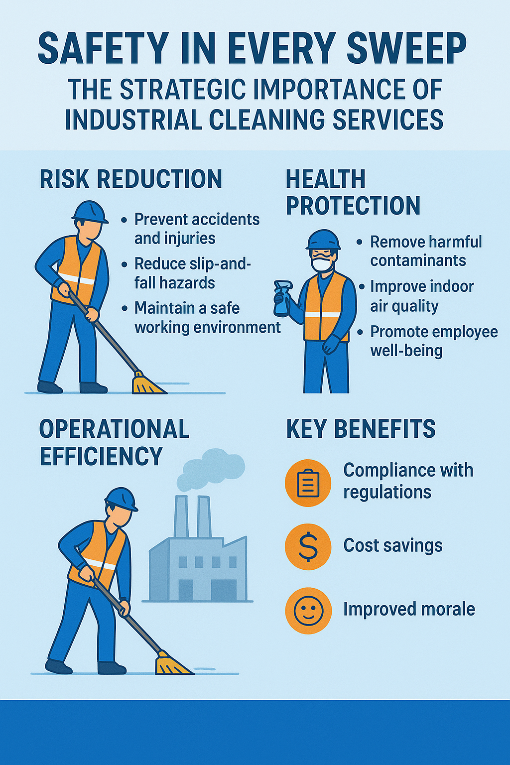 Industrial cleaning isn’t just about appearance — it is directly connected to the overall efficiency, health, and safety of the facility. A well-maintained industrial space reduces hazards, minimizes downtime, and protects both employees and machinery.Here’s why professional cleaning matters: